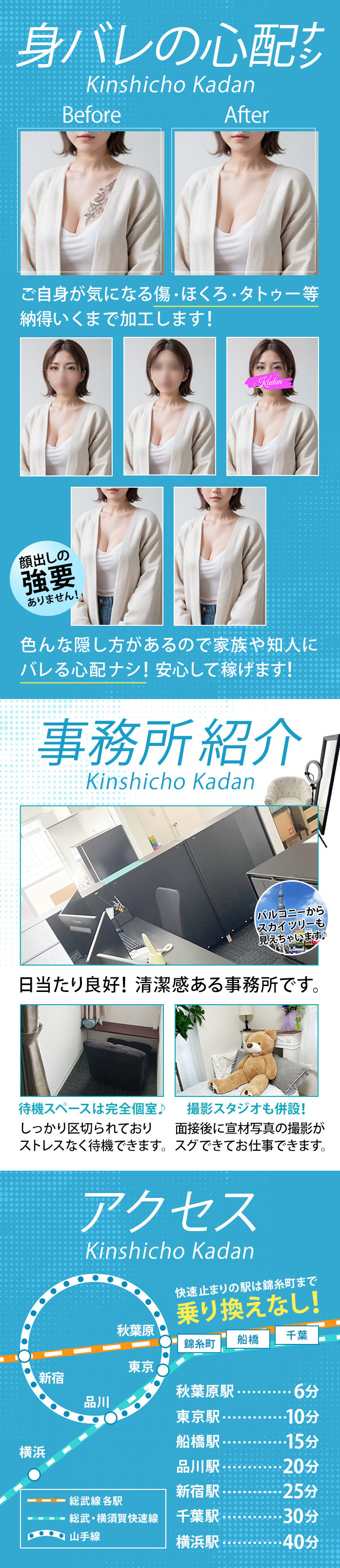 - 顔写真付の現住所記載身分証+本籍地が記載された住民票など 体験入店希望の方はスカート